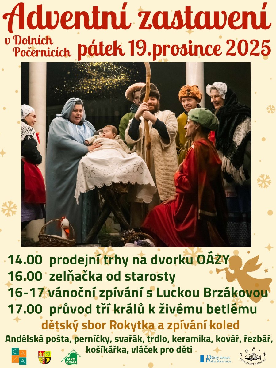Ve 14 hodin otevíráme brány dvorku mezi OÁZOU a KC Jako doma, kde na vás čekají stánky s vánočním zbožím, občerstvením, dílnička a vánoční vláček pro děti, polévka servírovaná panem starostou, tradice a zvyky, živé zpívání s Luckou Brzákovou.