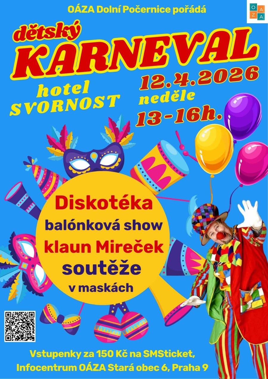 Dětský karneval se uskuteční v neděli 12. dubna 2026 od 13 do 16 hod v krásném sále hotelu Svornost v Praze - Dolních Počernicích. Jednotné vstupné 150 Kč.
